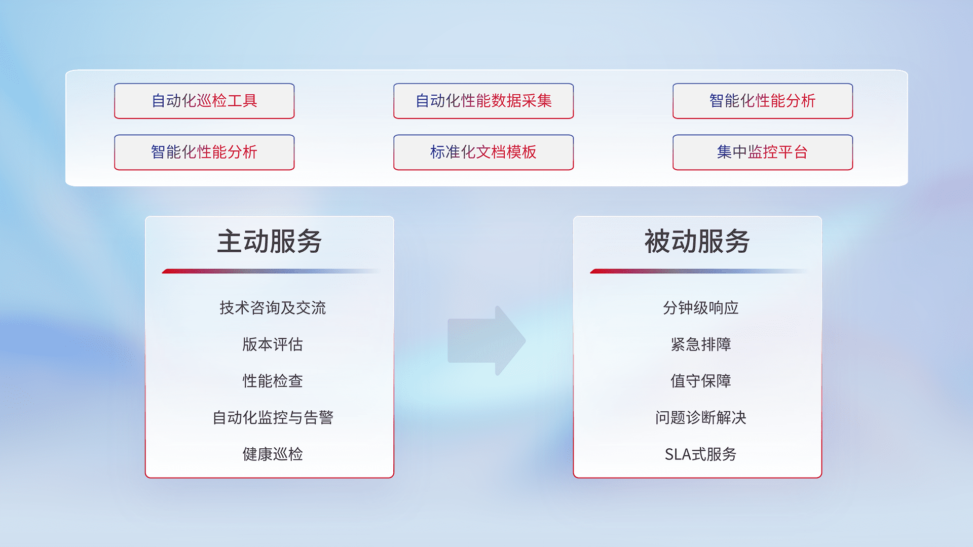 智能化工具和标准化文档,,,,保障服务质量,,,,提供主动服务(包含技术咨询、、、、版本评估、、、性能检查、、自动化监控与告警、、健康巡检)和被动服务包含(分钟级响应、、紧急排障、、、、值守保障、、、、问题诊断解决、、、、SLA服务)。。