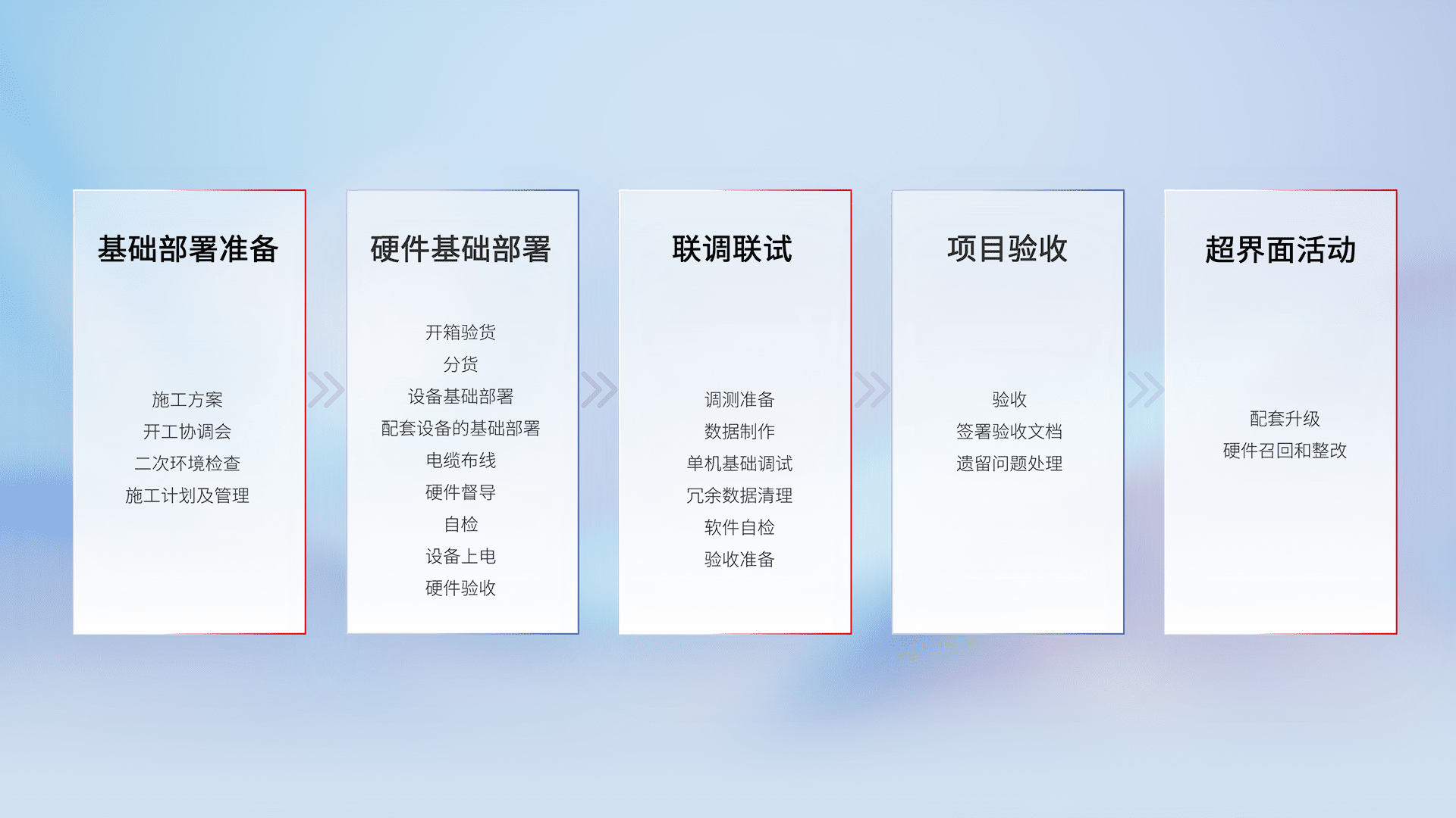 从基础部署准备、、、、硬件基础部署、、联调联试、、、、项目验收、、越界面活动的全过程可追溯,,,保证施工质量和进度。。。。